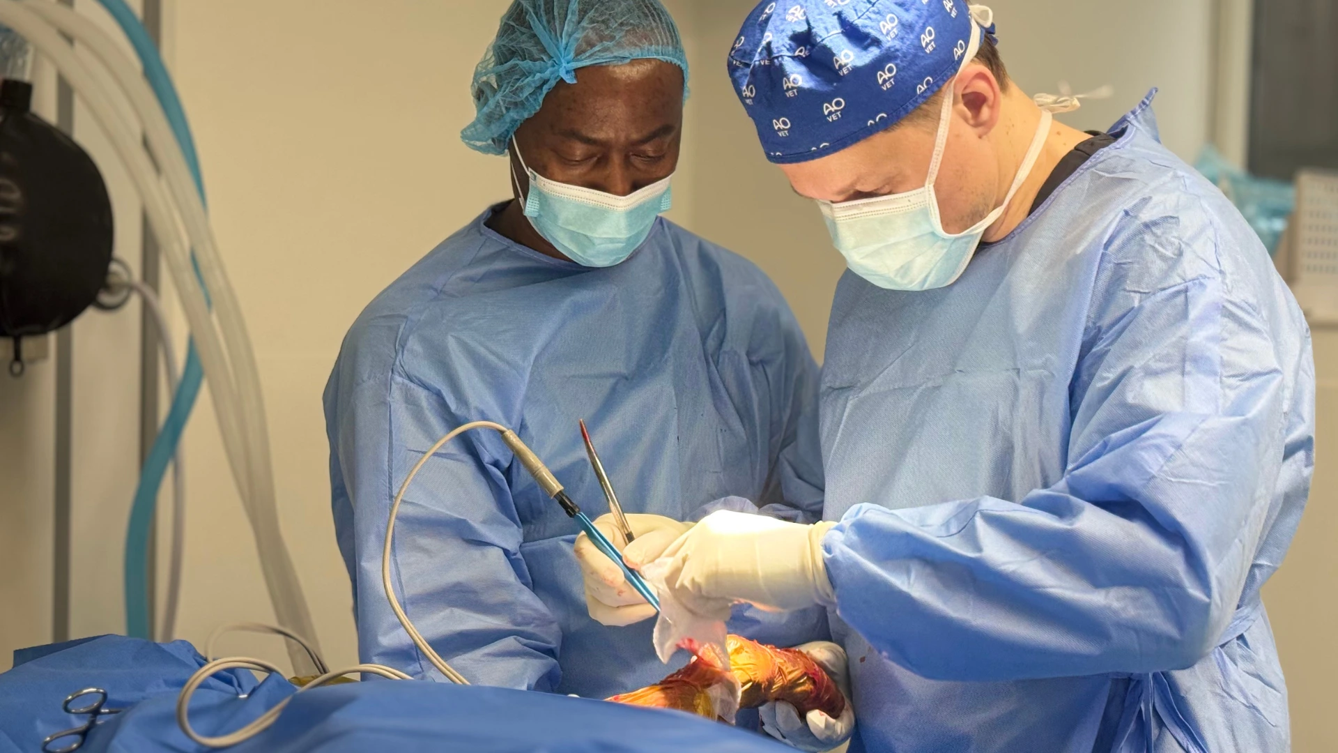 The surgical team prepared Max's joint for fusion, removing damaged cartilage and packing the joint with bone graph material to act as a supportive scaffold as new bone grows. A specially designed metal plate was then carefully positioned to hold everything in alignment as the bones fused together.